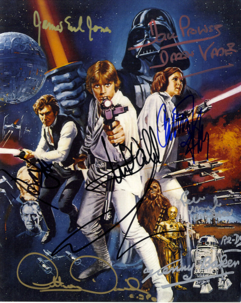 Signed by Mark Hamill, Harrison Ford, Carrie Fisher, Kenny Baker, Anthony Daniels, James Earl Jones, Dave Prowse, peter Mayhew & George Lucas